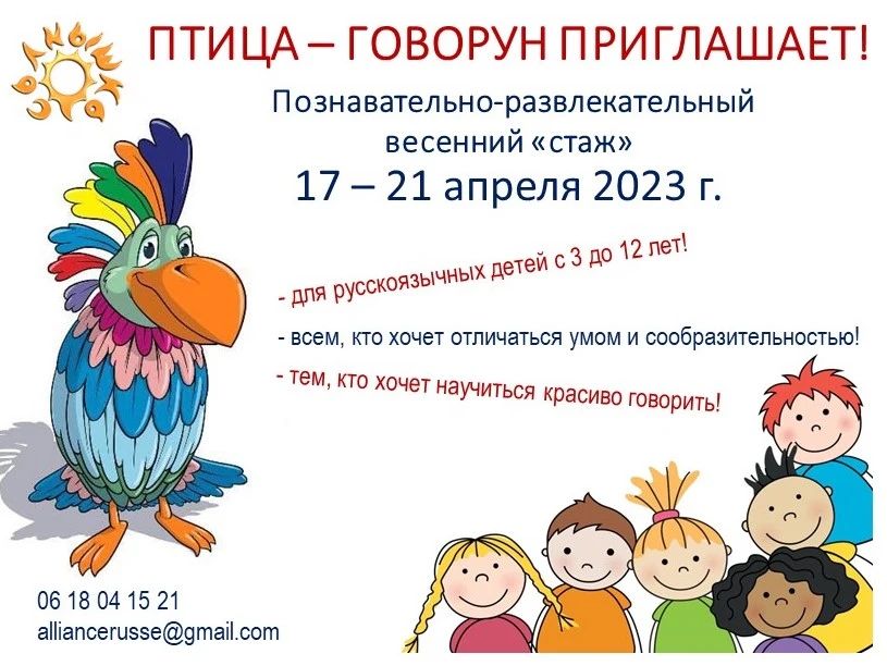 С 17 по 21 апреля 2023 г. в русской школе "Солнышко" пройдет весенний познавательно-развлекательный "стаж" на каникулах "ПТИЦА-ГОВОРУН ПРИГЛАШАЕТ"!