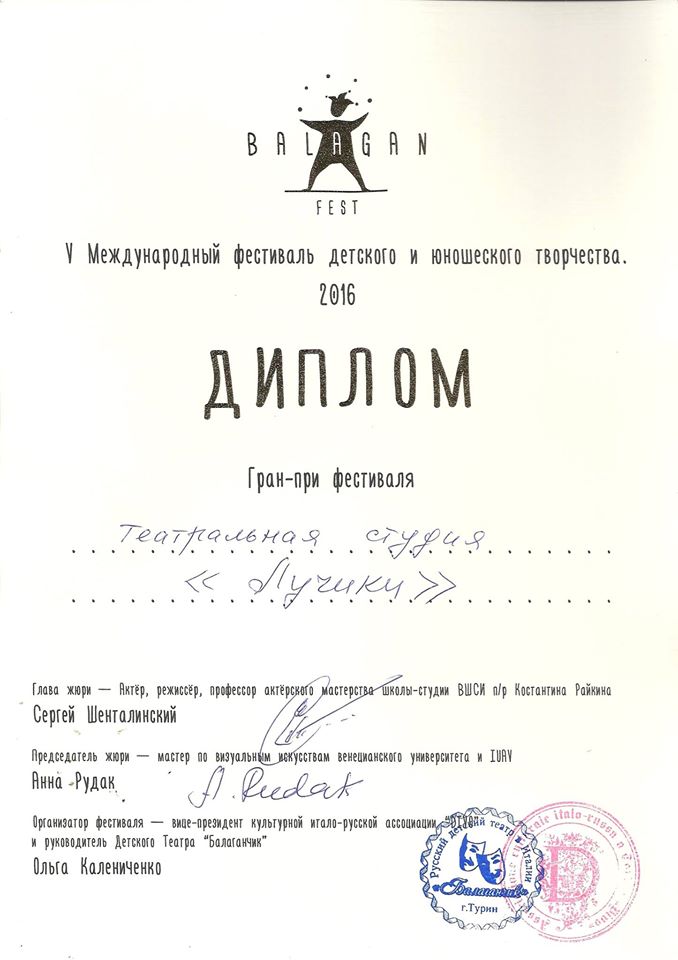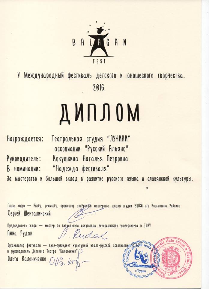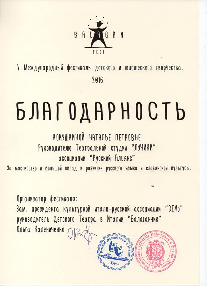 В Турине наши юные актёры и руководитель Наталья Кокушкина получили и другие замечательные дипломы, порадуемся за них! Большое спасибо организатору фестиваля - Детскому театру "Балаганчик" за приглашение и тёплый приём!