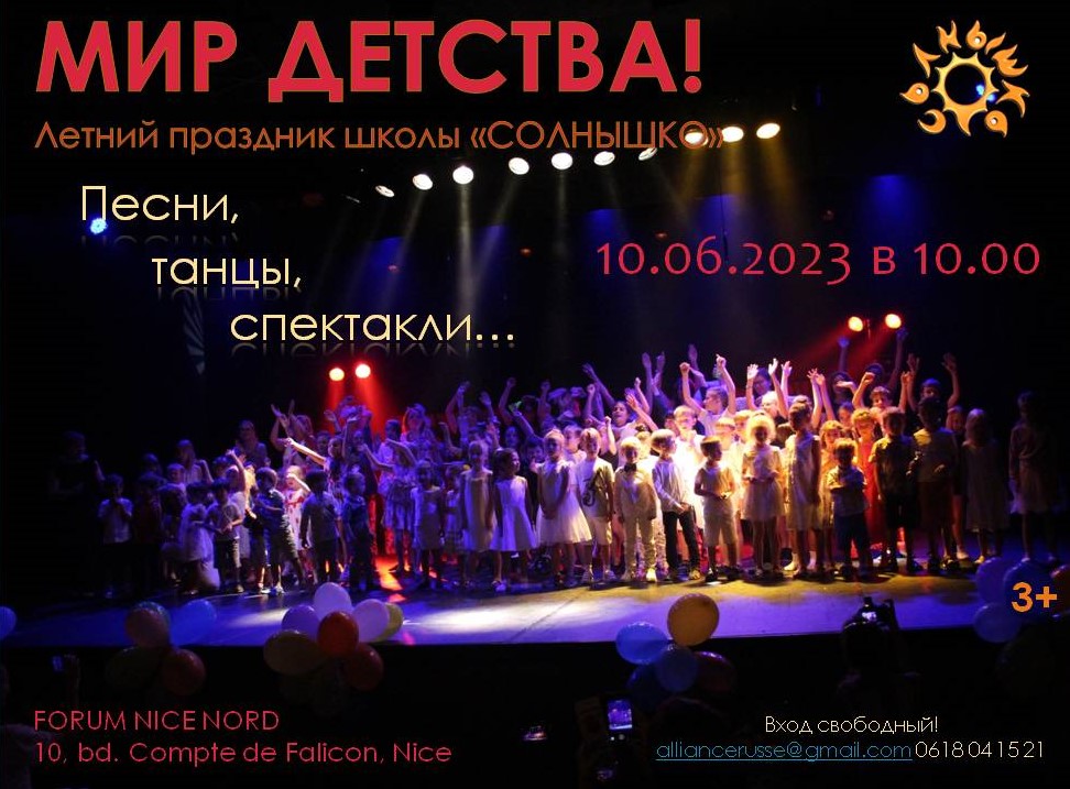 10 июня 2023 г. в 10:00 в Forum Nice Nord пройдет традиционный летний праздник школы "Мир детства!" - отчётный концерт русской школы "Солнышко"!
