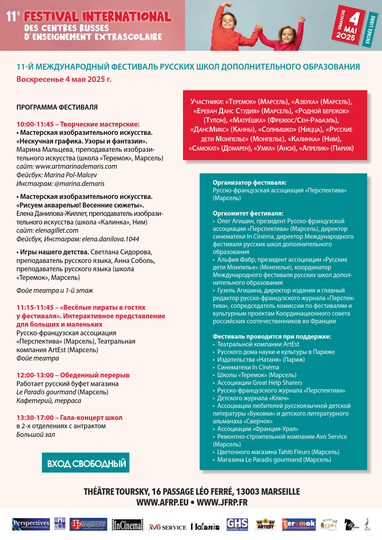 11 фестиваль в Марселе 03 мая 2025 Завтра, 4 мая 2025 г., наша старшая театральная студия выступает на 11-ом международном фестивале русских школ дополнительного образования в Марселе со спектаклем "Вредные советы" (по Григорию Остеру). Назад Вперед